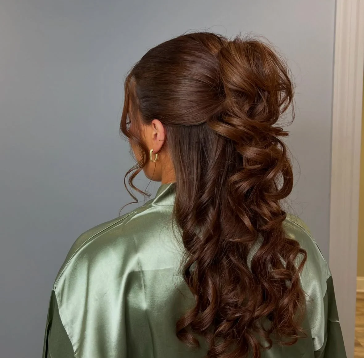 Woman with long, curly brown hair styled in an elegant ponytail, wearing a green satin robe, viewed from behind.