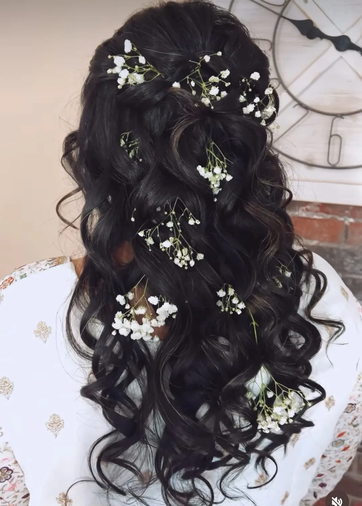 Curly dark hair adorned with small white flowers arranged in an elegant half-updo style.