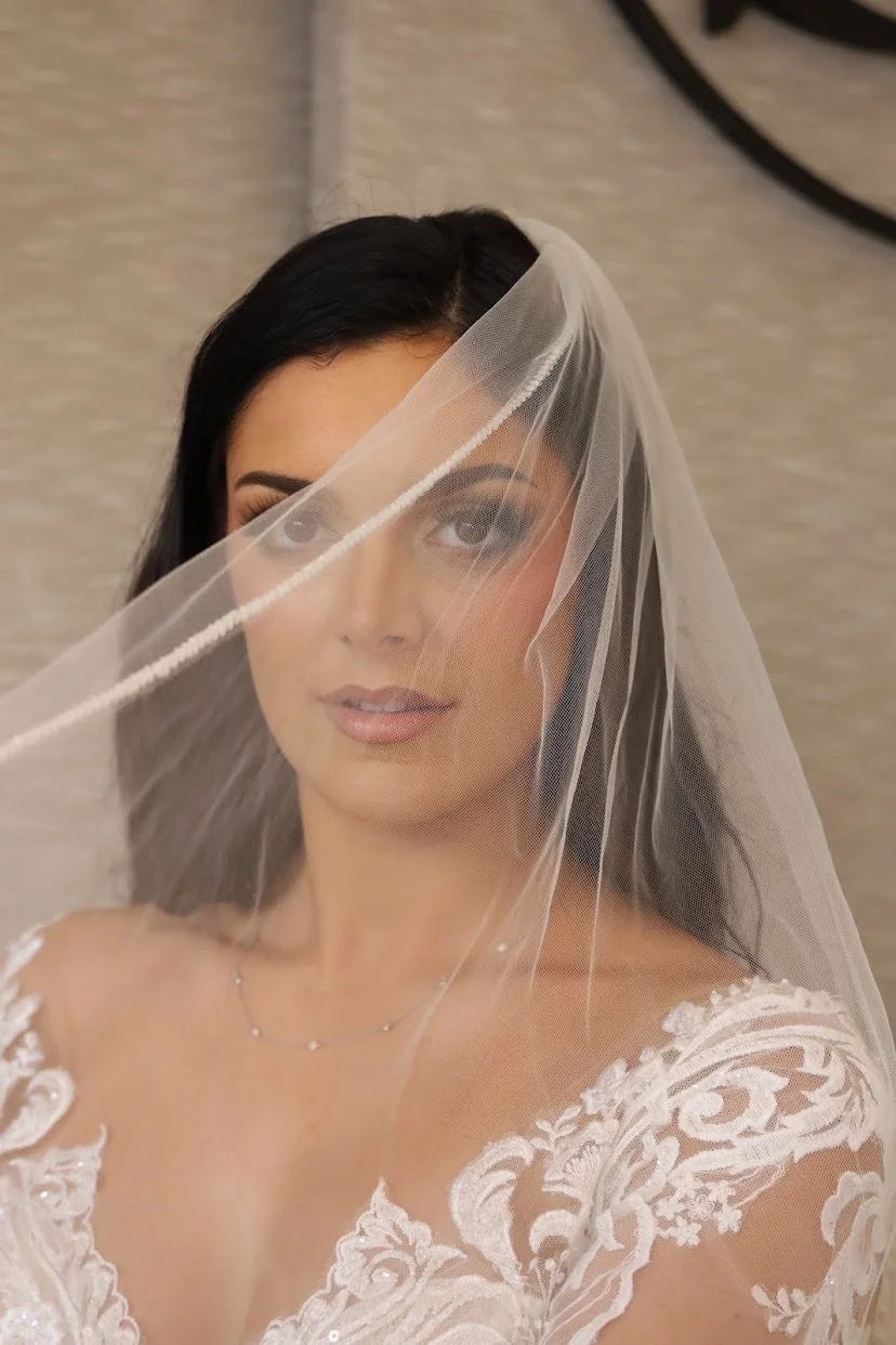Woman in a lace wedding dress standing near a floral arrangement and circular logo.
