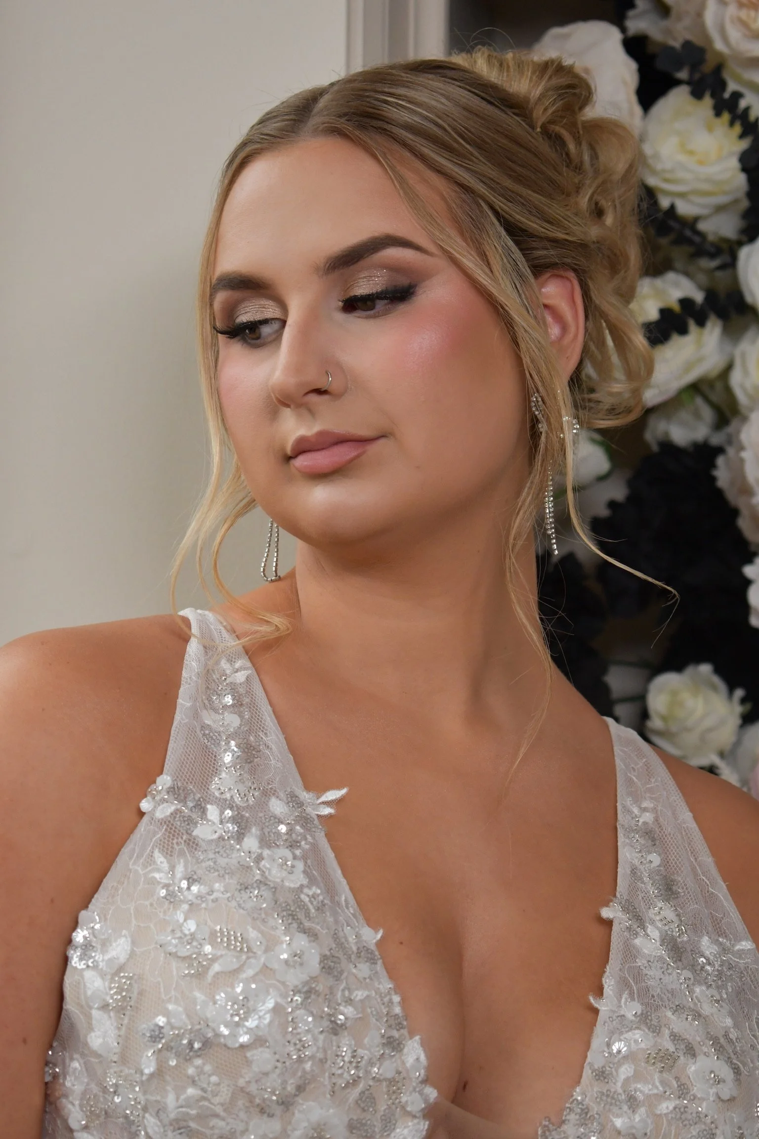 Profile of a woman with slicked-back hair in a bun, wearing a glittering, beaded dress, standing beside a wall of flowers.