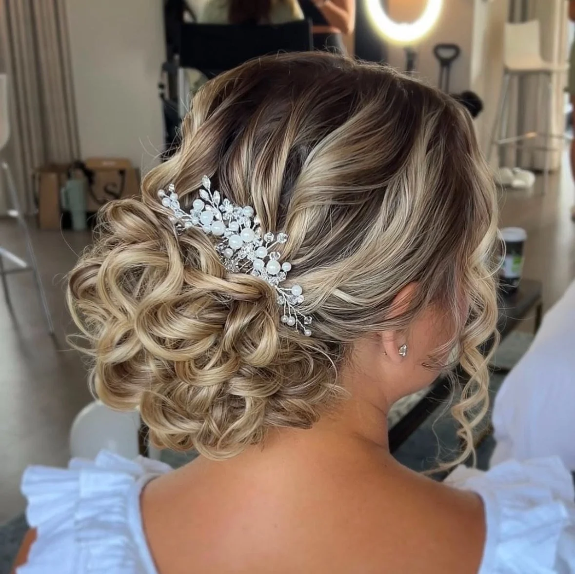 Elegant bridal updo hairstyle with blonde curls and decorative hairpiece