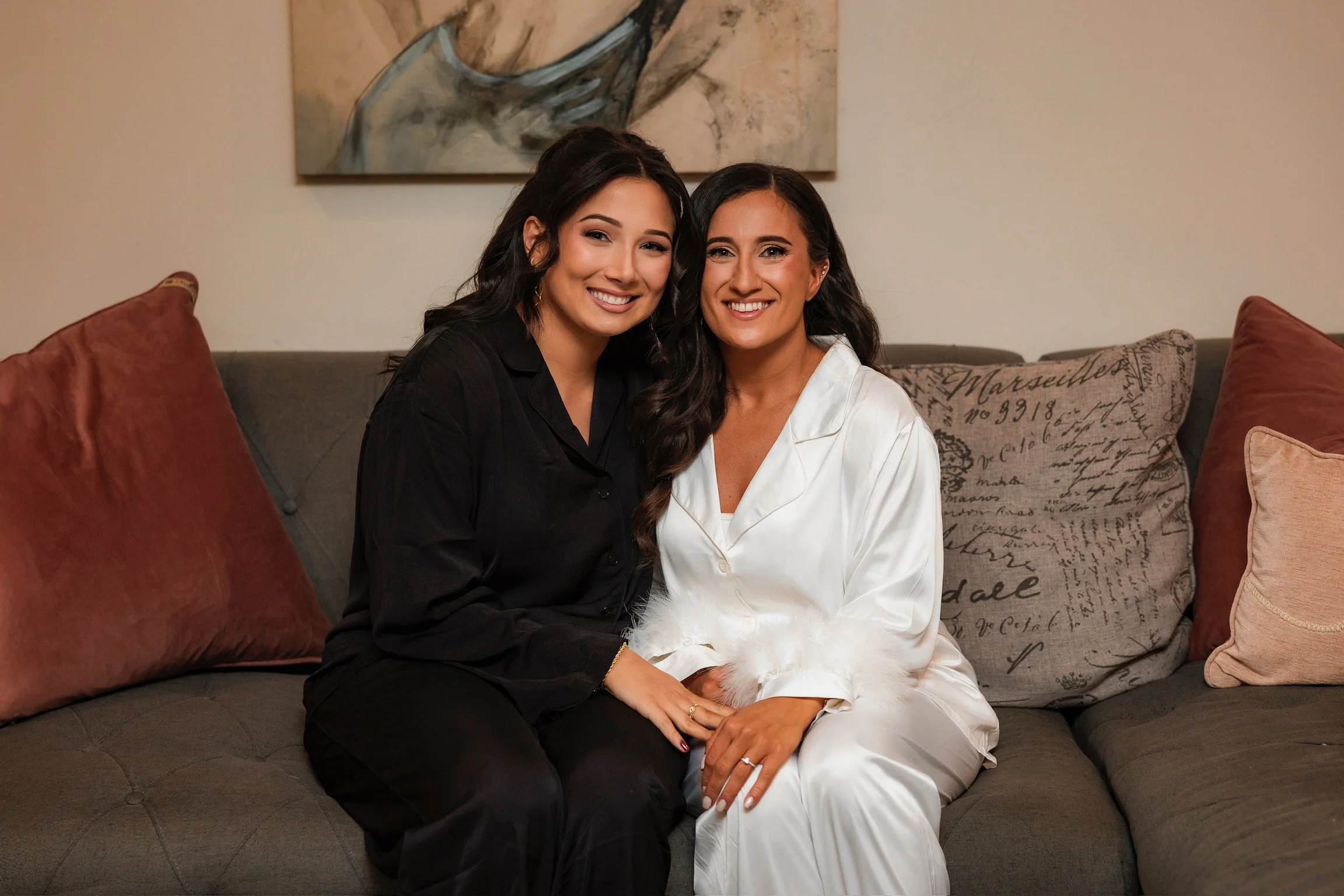 Two women sitting on a couch, one wearing black and the other in white, smiling at the camera.